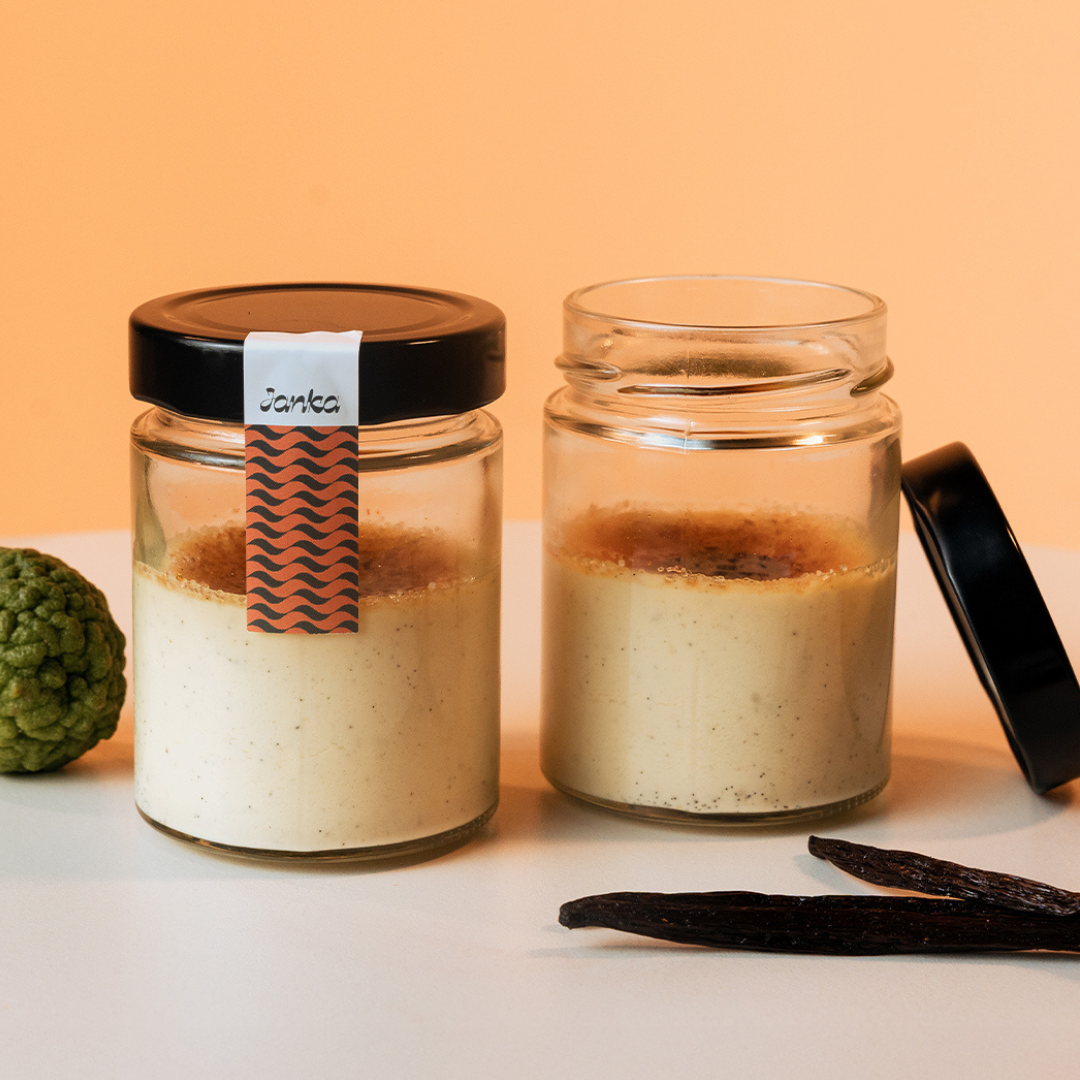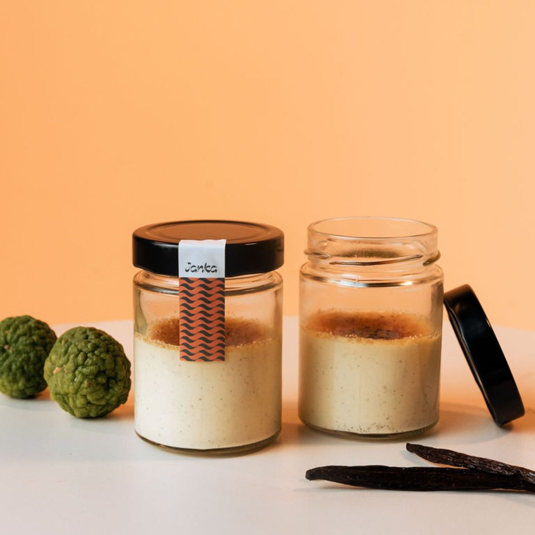 Icône intemporelle de la pâtisserie française, la Crème Brûlée se réinvente chez Janka dans une version subtilement exotique. Sous sa texture crémeuse et parfumée à la vanille de Madagascar se cache une touche vive et rafraîchissante de combava, petit agrume d’Indonésie. Une interprétation élégante et surprenante, qui mêle tradition et voyage dans une même cuillère.